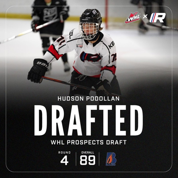 With the 89th overall pick in the 4th round of the 2024 WHL Bantam Draft, the Kamloops Blazers selected forward, Hudson Podollan. Podollan joined the RHA U15 Prep team for the 2023-24 season and put up an impressive 10 goals and 18 assists for 28 points in 27 games in the regular season, and had 1 goal and 2 assists for 3 points in 3 playoff games in the CSSHL.