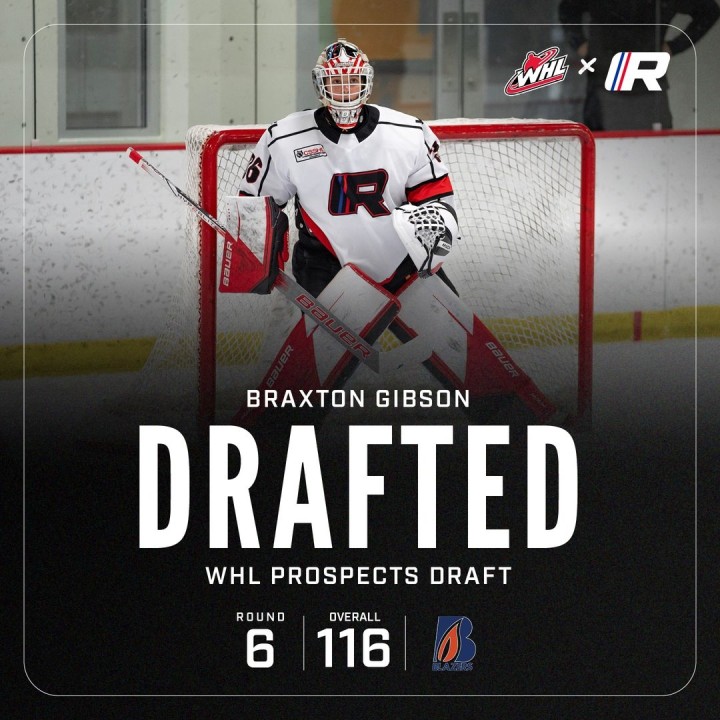 With the 116th overall pick in the 6th round of the 2024 WHL Bantam Draft, the Kamloops Blazers selected goaltender, Braxton Gibson. Gibson joined the RHA U15 Prep team for the 2023-24 season and put up a .891 SV% and 3.62 GAA in 17 regular season games, and had a .879 SV% and 3.97 GAA in 1 playoff game in the CSSHL.